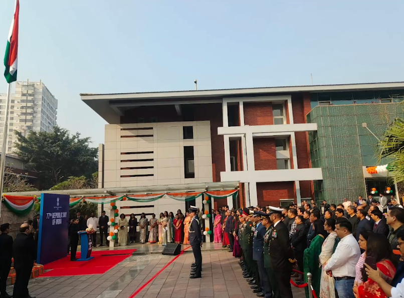 ನವದೆಹಲಿ: 77ನೇ ಗಣರಾಜ್ಯೋತ್ಸವವನ್ನು ದೇಶದಲ್ಲಿ ಮಾತ್ರವಲ್ಲದೆ, ವಿದೇಶಗಳಲ್ಲೂ ಗೌರವ ಭಾವದಿಂದ ಆಚರಿಸಲಾಗುತ್ತಿದೆ.  ಬಾಂಗ್ಲಾದೇಶದ (Bangladesh) ಢಾಕಾದಲ್ಲಿರುವ ಭಾರತೀಯ ರಾಯಭಾರಿ ಕಚೇರಿಯಲ್ಲಿ, ಭಾರತದ 77ನೇ ಗಣರಾಜ್ಯೋತ್ಸವವನ್ನು (Republic Day)  ಉತ್ಸಾಹ ಮತ್ತು ದೇಶಭಕ್ತಿಯ ಪ್ರತೀಕವಾಗಿ ಆಚರಿಸಲಾಯಿತು.